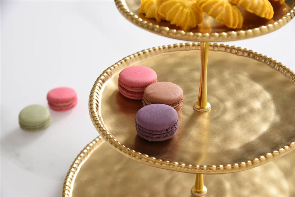 3-Tiered Stand from our Monte Carlo collection. Whether displaying pastries, tea sandwiches or desserts, this tiered porcelain stand is a tasteful way to serve guests. Crafted in a luxurious matte gold-toned high-fired porcelain with gold beads. Food safe, tarnish free, dishwasher safe, oven safe to 500°F. Easy Care. *Assembly Required*