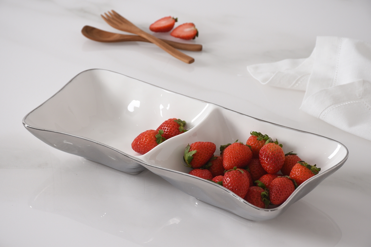 2 Section Server in Thin & Simple. Great for serving appetizers, desserts and sides! Serve chips and dip, an assortment of cookies or a duo of vegetables. This server also makes for a perfect nut and/or candy dish for any countertop! Crafted in a luxurious white high-fired porcelain and dazzling silver. Food safe, dishwasher safe, oven safe to 500°. Tarnish and stain-free. Easy Care.