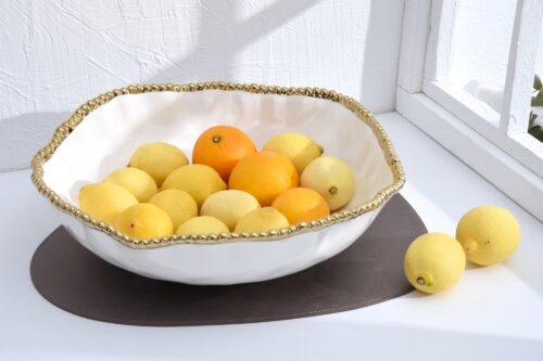 Oversized Serving Bowl in Golden Salerno. Perfect for your next dinner party, holiday or as a dining room table centerpiece! Roasted potatoes and veggies, spaghetti and meatballs or a simple salad serve up nicely in this beautiful crafted bowl. High-fired white porcelain with lustrous gold beads in titanium. Food safe. Dishwasher safe. Oven safe to 500°. Easy Care.