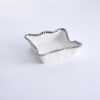 Dinner napkin/guest towel holder in Salerno. Add a touch of organization and elegance with this magnificent napkin holder. Place rolled cloth or a stack of paper dinner napkins in this beautiful holder for your next buffet. Also great in the powder room for disposable guest towels. Serve up small pastries, sliced fruit and grilled vegetables. Gleaming white porcelain with lustrous gold beads in titanium. Food safe. Dishwasher safe. Oven safe up to ◦. Easy Care.