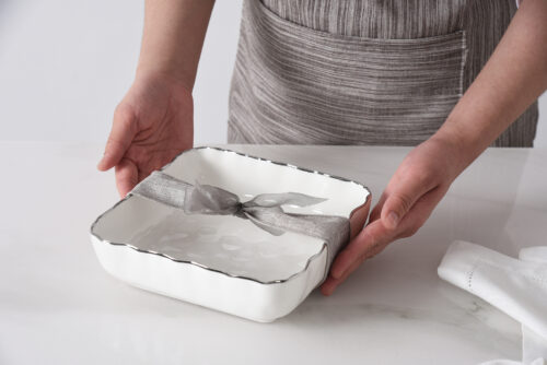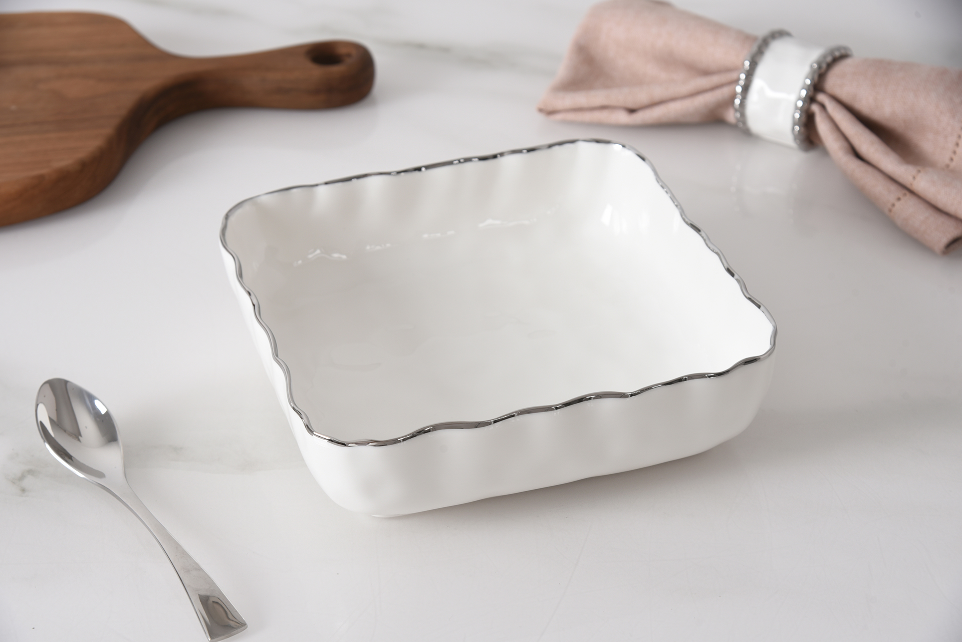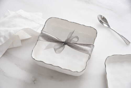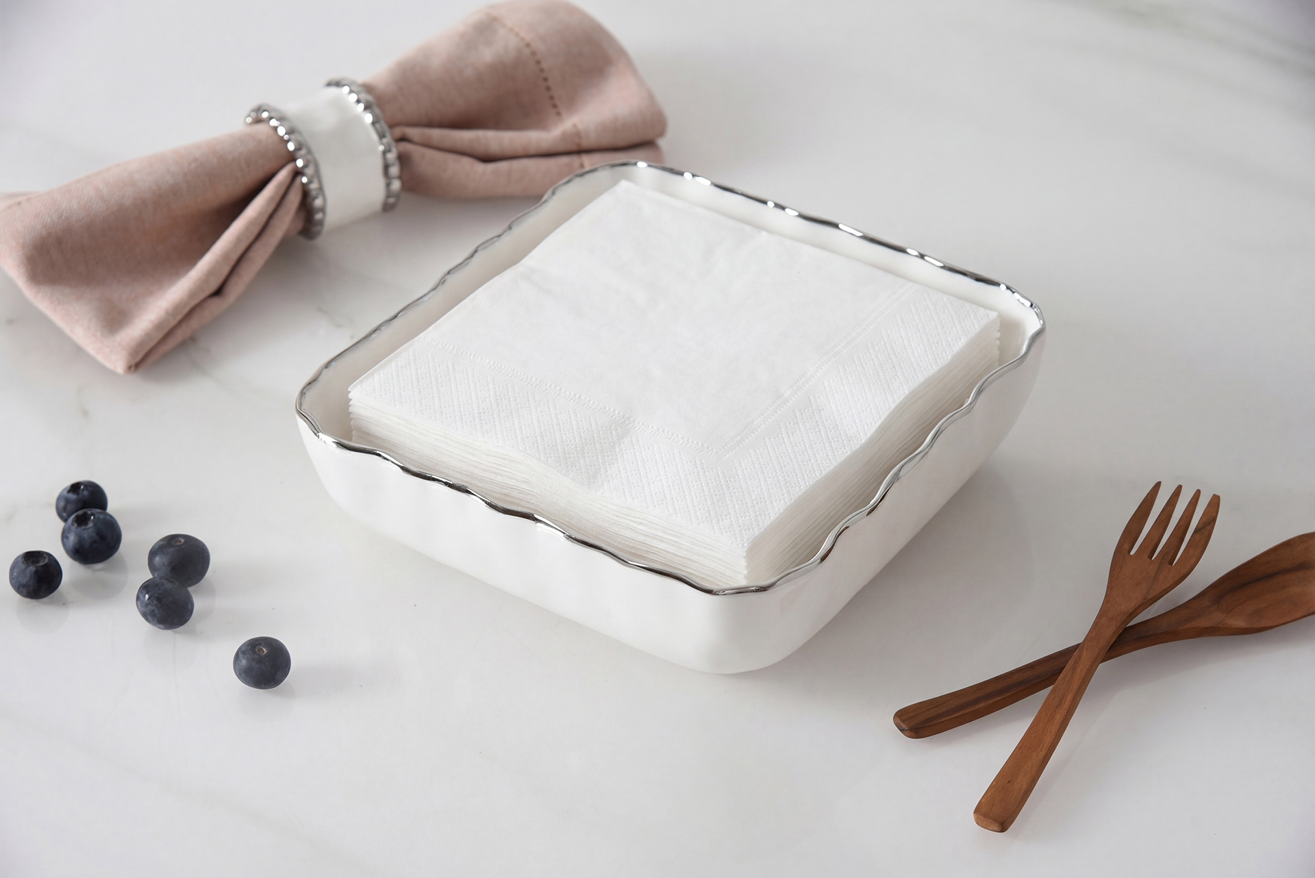 Add a touch of refined elegance to your table with the Portofino Plata Cocktail Napkin Holder. Expertly crafted from luminous white porcelain and accented with a graceful silver trim, this holder is designed to keep cocktail napkins neatly organized and easily accessible. Its sophisticated design complements both casual gatherings and formal occasions, making it a versatile addition to any serveware collection. Food safe, tarnish-resistant, dishwasher safe, and oven safe up to 500°F, it combines timeless beauty with everyday practicality.
