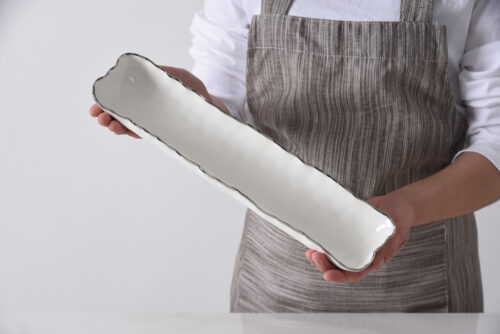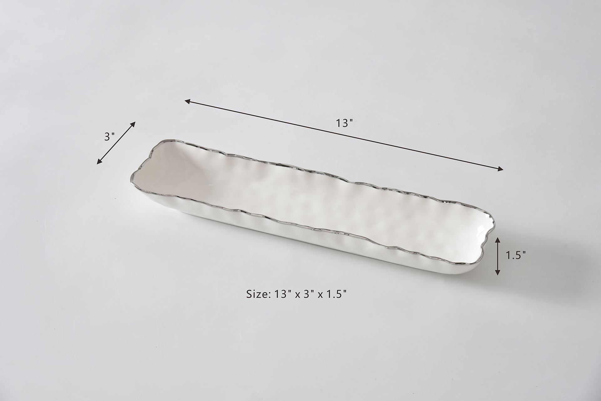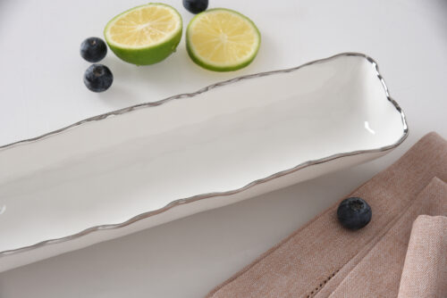 Present your favorite crackers, cookies, and small treats with refined elegance using the Portofino Plata Cracker Tray. Crafted from luminous white porcelain and finished with a delicate silver trim, this tray brings a sophisticated touch to any table setting. Designed for both style and practicality, it is food safe, tarnish-resistant, dishwasher safe, and oven safe up to 500°F.