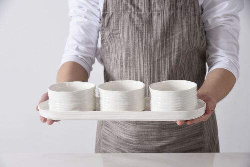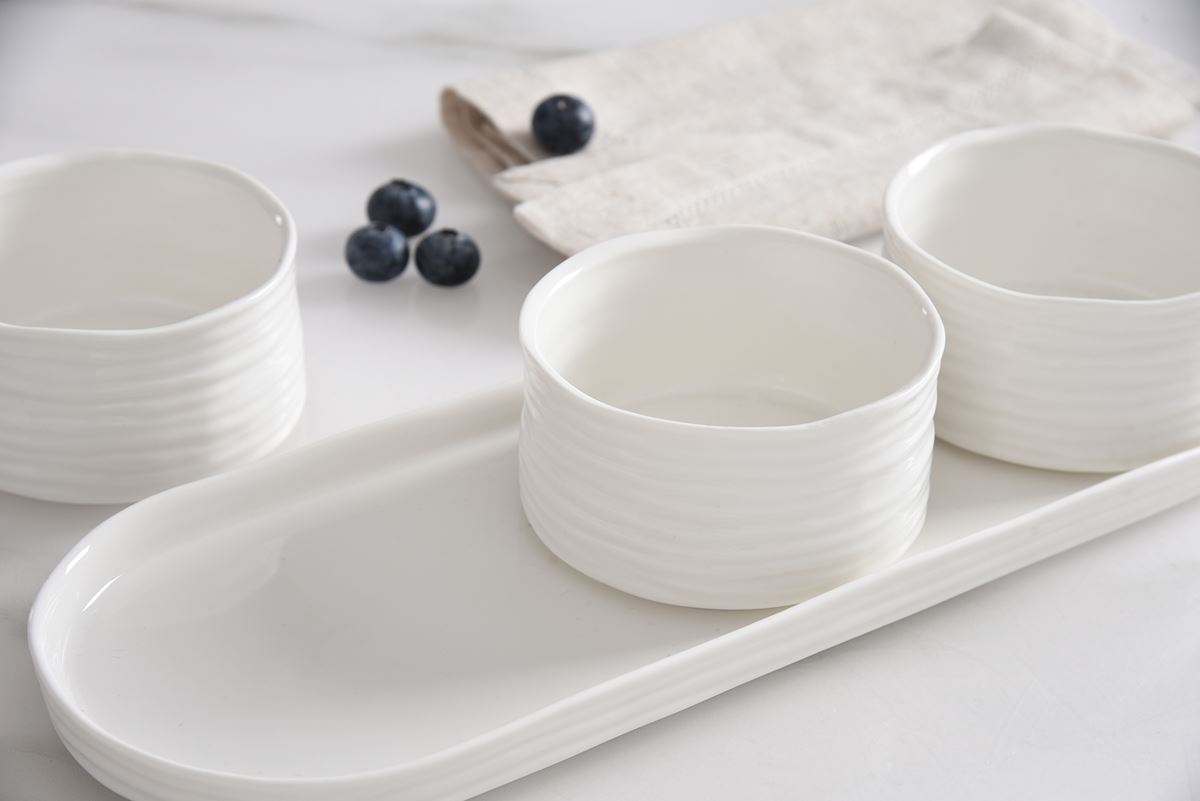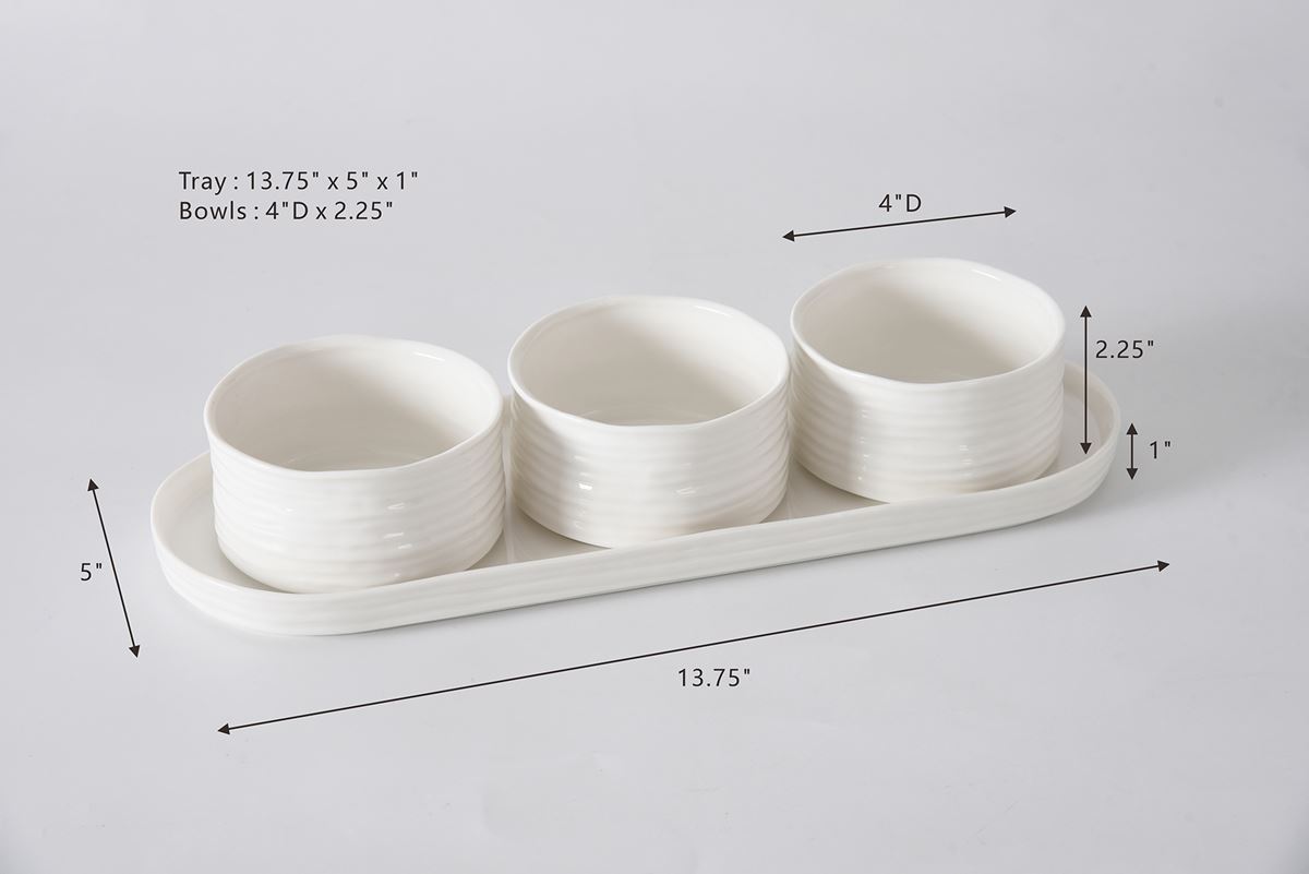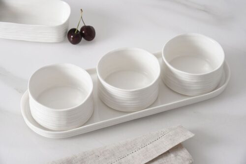 Serve in style with the Le Blanc Entertaining Set – three versatile snack bowls elegantly arranged on a high-fired porcelain tray. Ideal for appetizer spreads, savory dips, olives, or sweet bites like candies and cookies, it’s also perfect for presenting a trio of toppings at barbecues and buffets. With clean lines and organic shapes, this artfully crafted set celebrates the beauty of simplicity. Made from durable porcelain that’s microwave safe, oven safe up to 500°F, dishwasher safe, food safe, and tarnish resistant. Sophisticated design meets everyday ease.