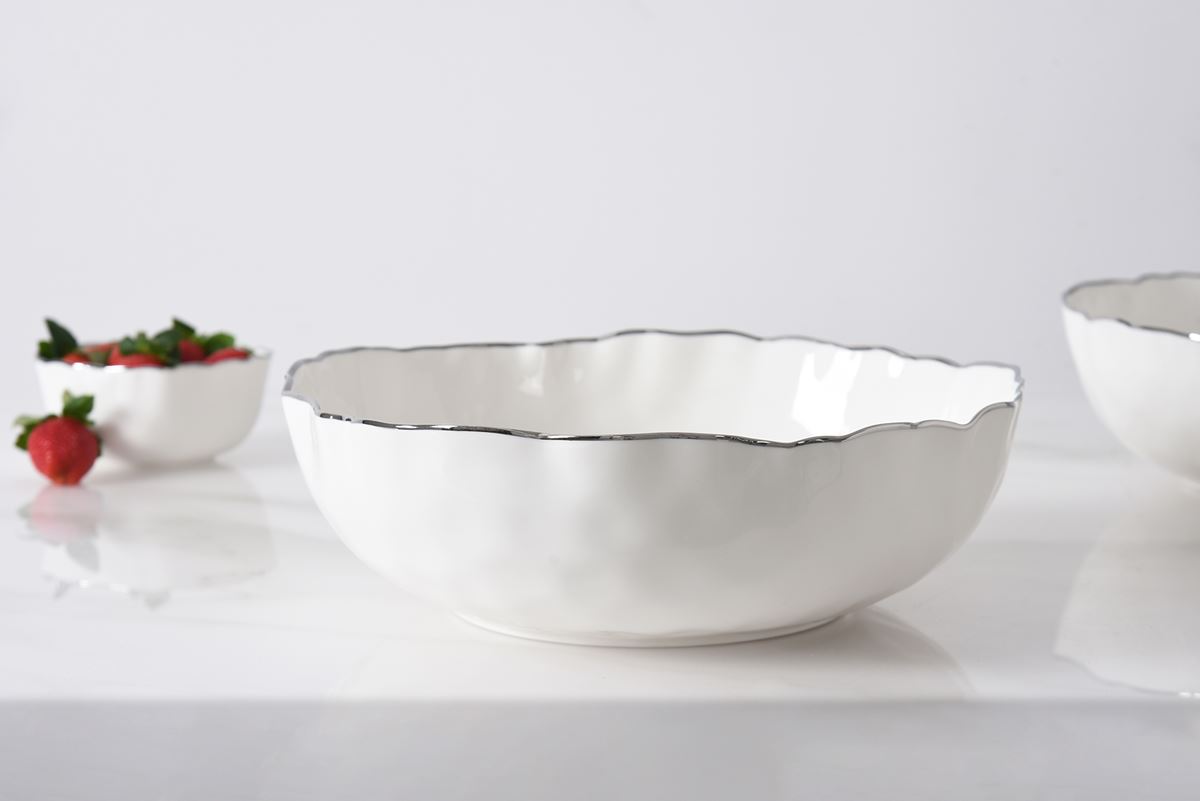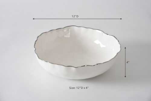 Make a statement at your next gathering with the Portofino Plata Large Bowl. Generously sized for serving hearty portions of pasta, salads, or snacks, this elegant bowl is ideal for entertaining or family-style meals. Its pristine white porcelain body is beautifully accented with a refined silver trim, adding a touch of sophistication to any table. Food safe, tarnish-resistant, dishwasher safe, and oven safe up to 500°F.