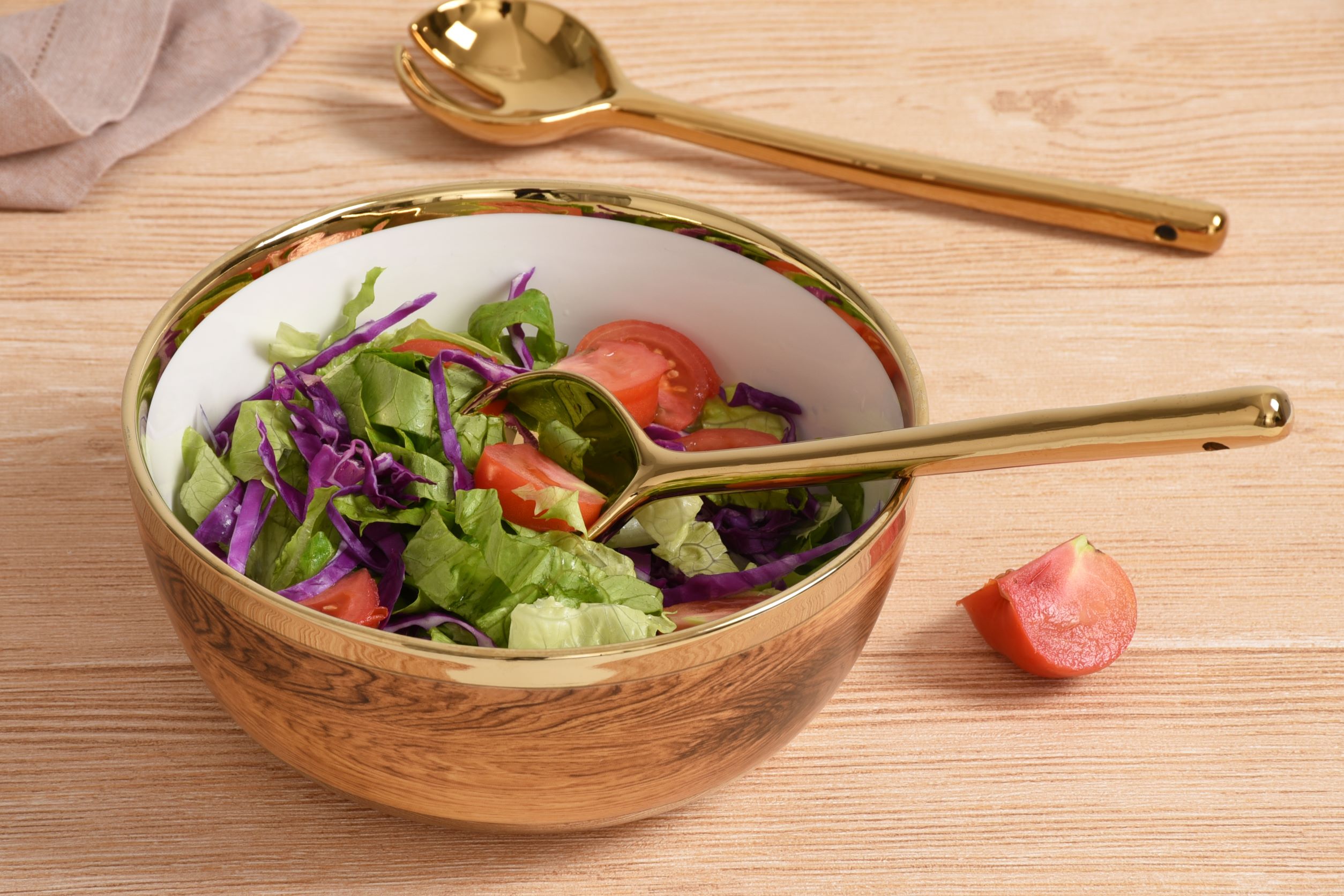 These Salad Servers from our Madera Collection brings style and elegance to any table. Ideal for any dinner party. Crafted in a luxurious gold-toned porcelain. Dishwasher safe.