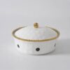 Medium Bowl from the Golden Salerno Collection. Generously sized to serve soups, salads and cereal. This perfectly portioned bowl is great for everyday use or special occasions. Crafted in gleaming white porcelain with lustrous gold beads. Food safe, tarnish free, dishwasher safe, oven safe to 500°F. Easy Care.