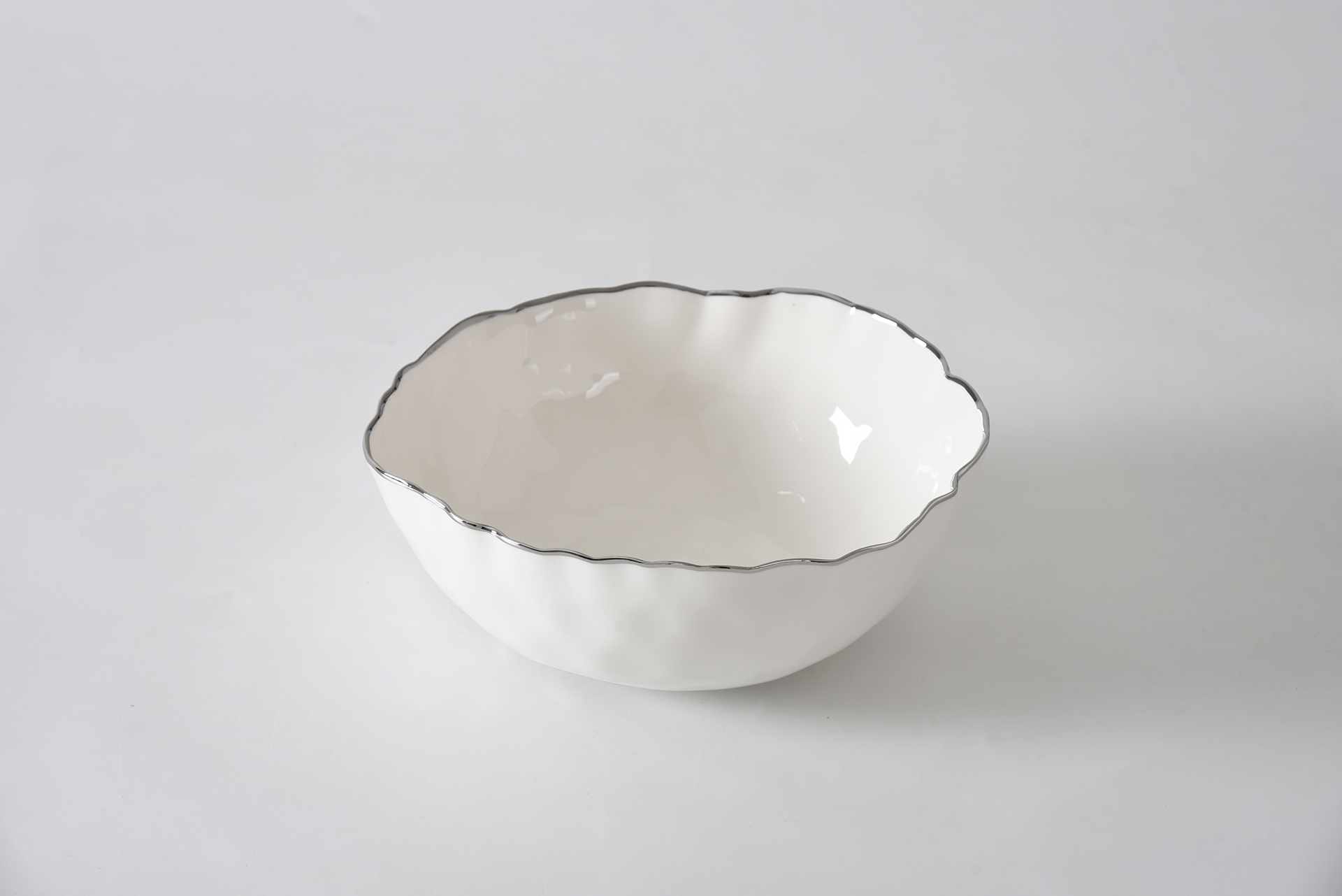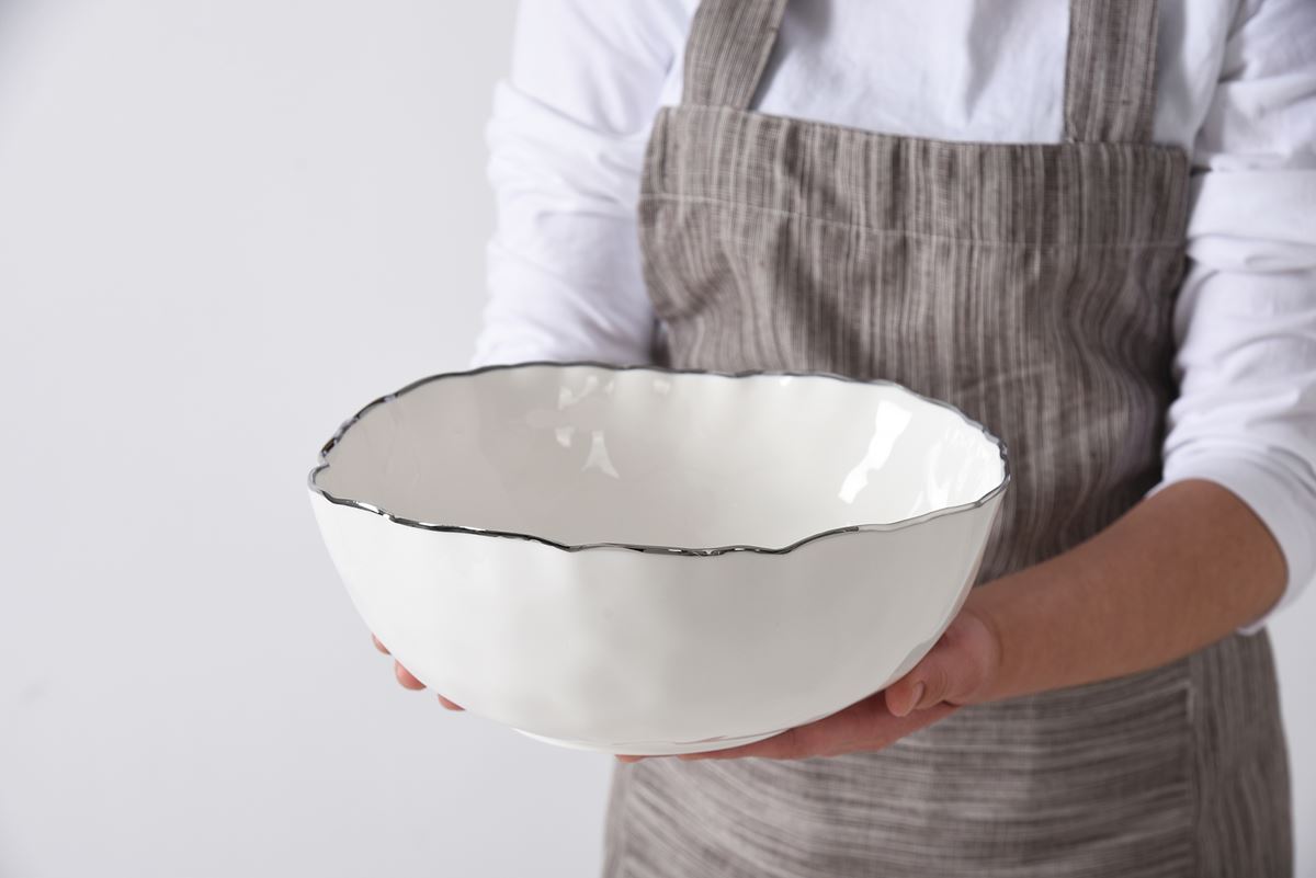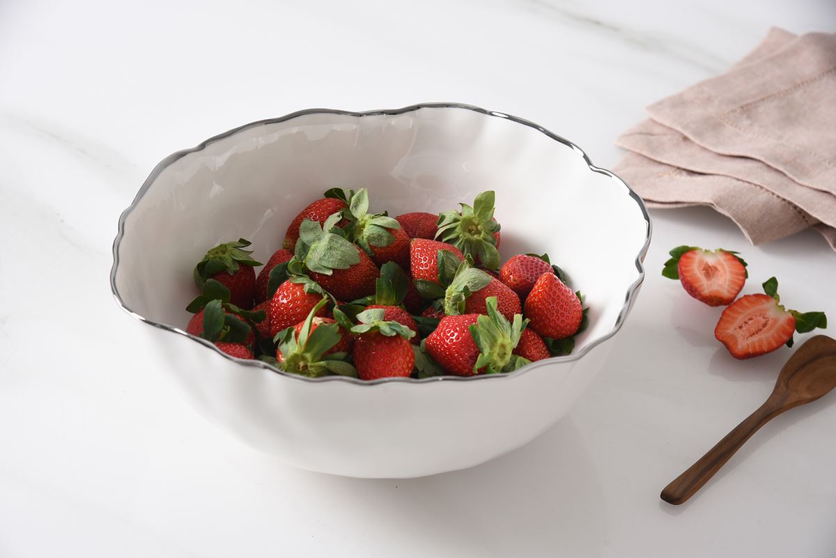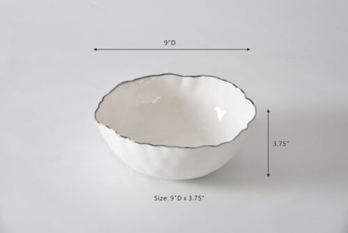 Designed for intimate dinners or small gatherings, the Portofino Plata Medium Bowl is perfectly sized for serving pasta, salads, chips, and more. Its luminous white porcelain body is beautifully accented with a refined silver trim, offering a sophisticated touch to any table. Food safe, tarnish-resistant, dishwasher safe, and oven safe up to 500°F. Whether you’re hosting or enjoying a quiet meal at home, it’s a versatile addition to your serveware collection that effortlessly blends style and function.