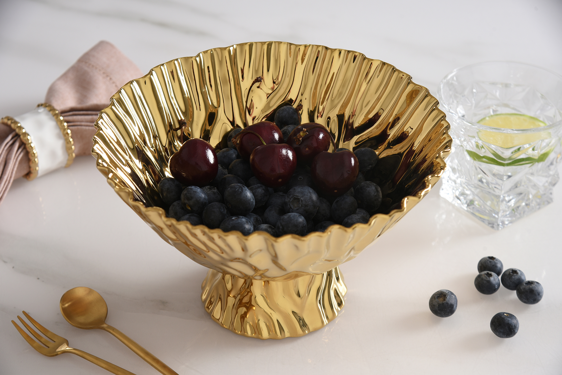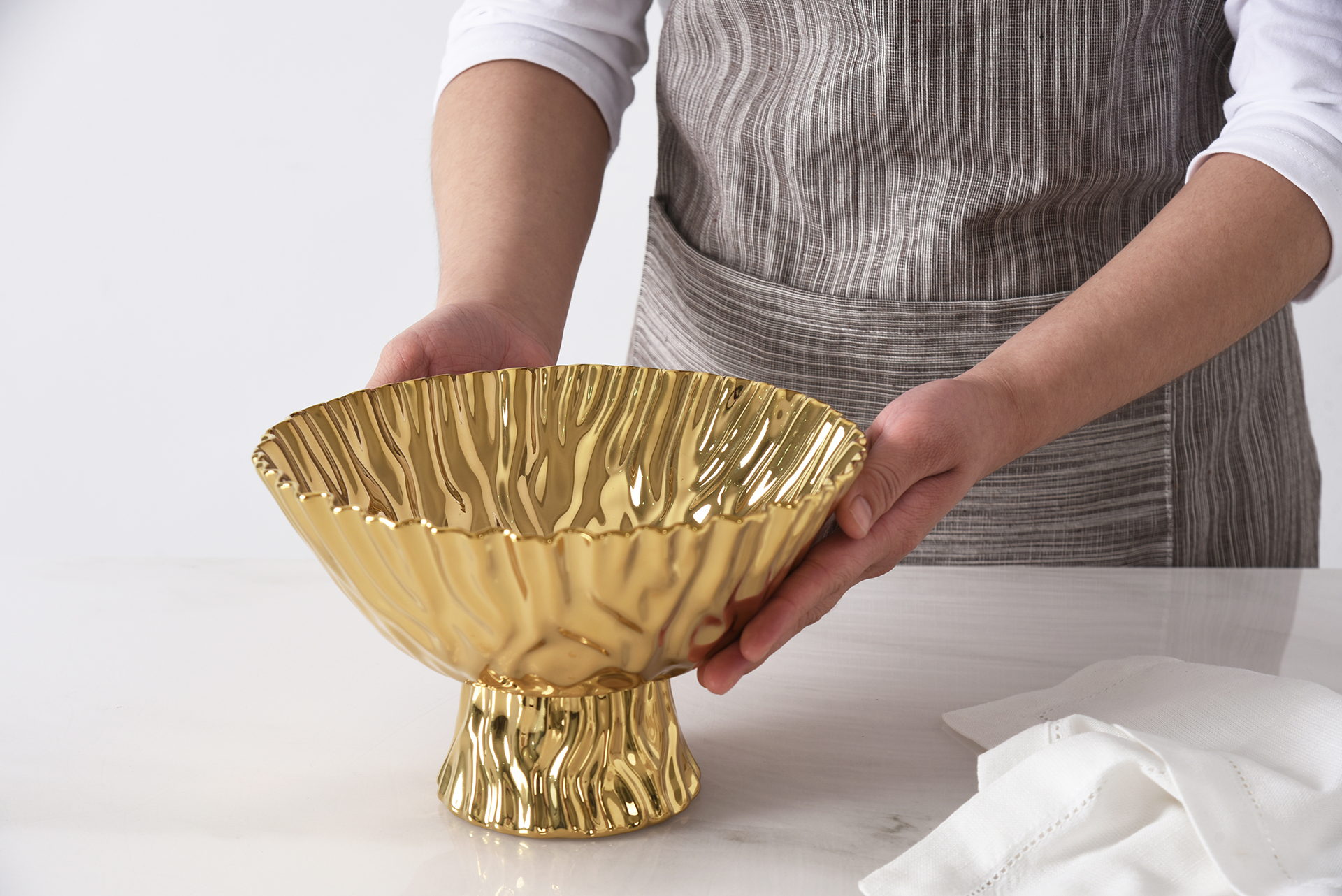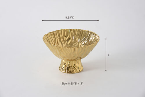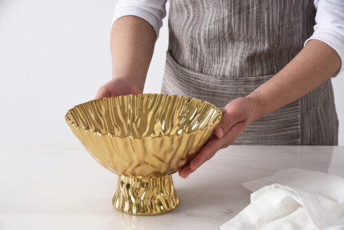 Gracefully elevate your table with the Mascali D’oro Medium Footed Bowl. Whether filled with fresh fruit or styled as a centerpiece, its luminous gold-tone finished high-fired porcelain brings timeless sophistication to any setting. Food safe, tarnish free, dishwasher safe, oven safe to 500°F. Easy Care.