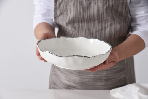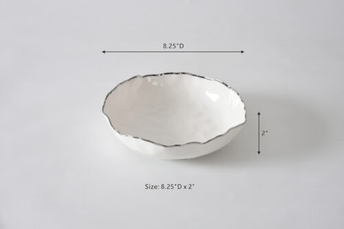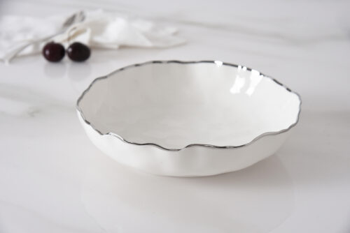 Elevate your table with this versatile Pasta Bowl from our Portofino Plata Collection. Ideal for serving pasta, salads, soups, and more. Expertly crafted from luminous white porcelain and accented with a graceful silver trim, it brings timeless elegance to any meal. Designed for everyday ease – food safe, tarnish-resistant, dishwasher safe, and oven safe up to 500°F.