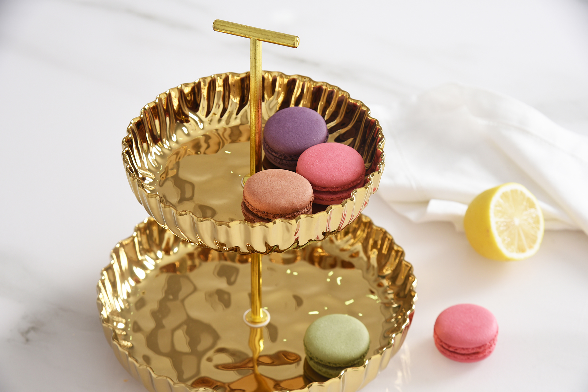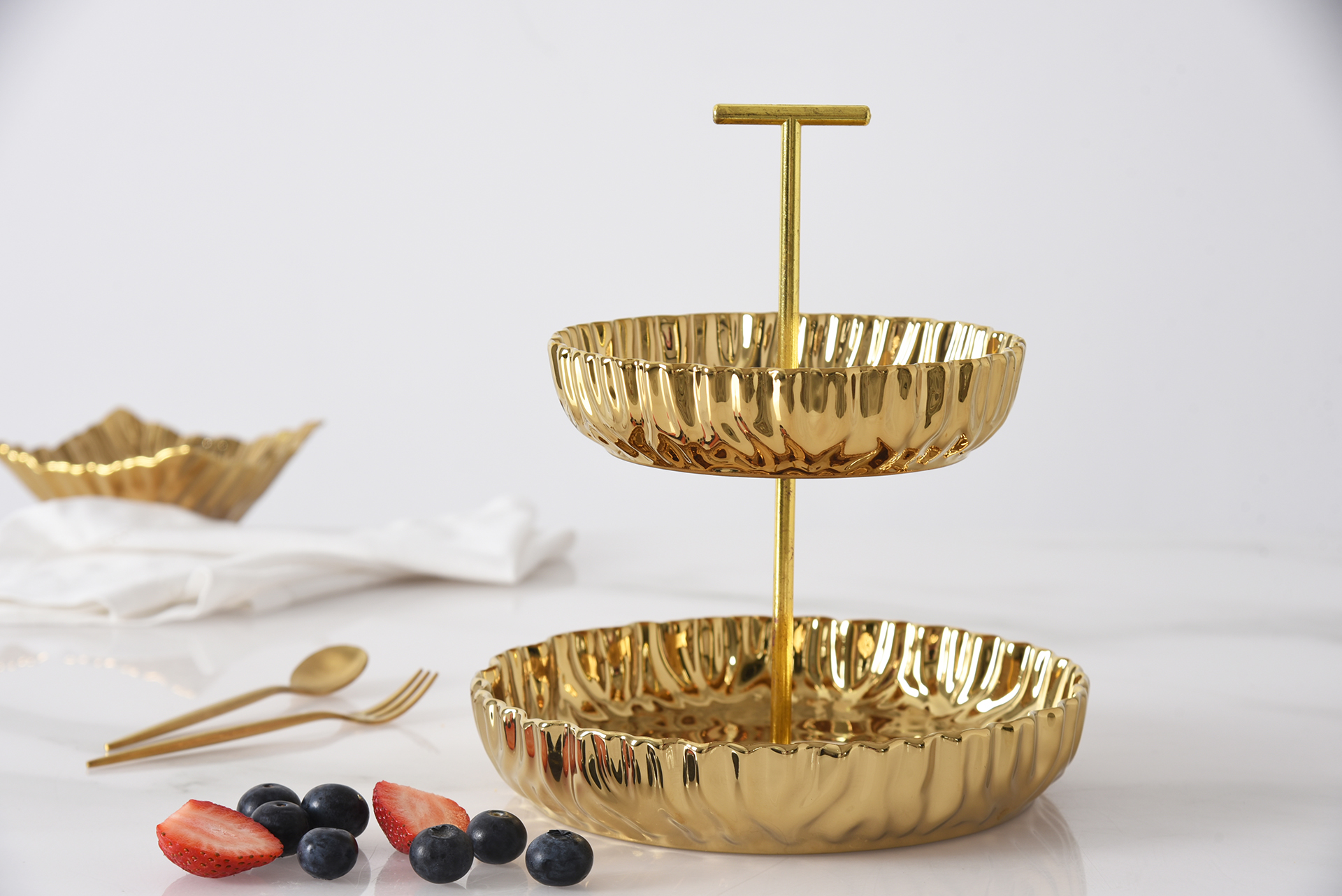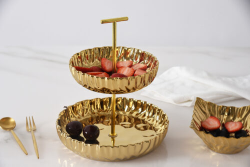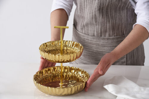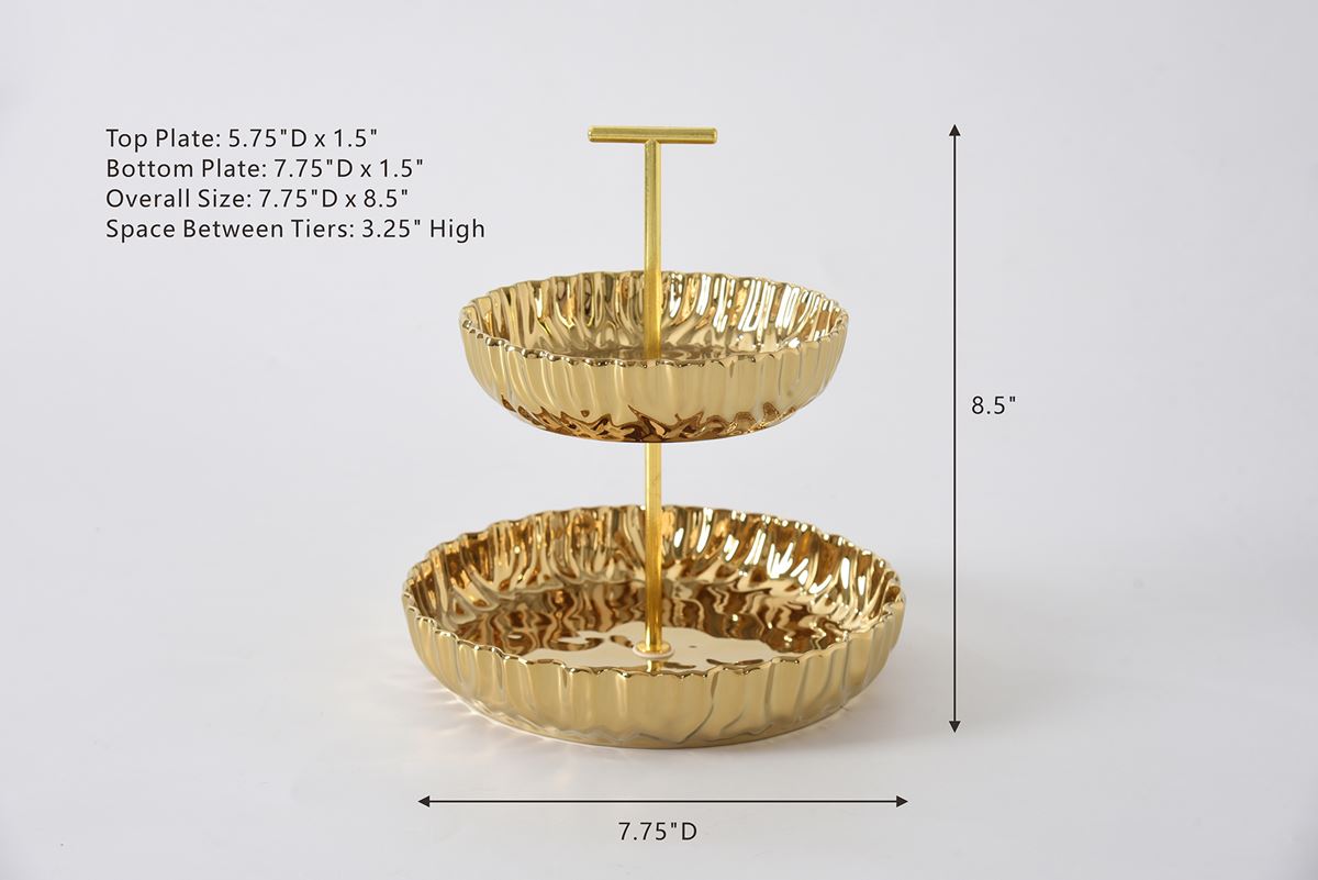 Small 2 Tier Stand from Mascali D’oro. A great addition to any kitchen, bathroom, or coffee table! Perfect for displaying appetizers or desserts for guests during parties or dinners. Striking and elegant gold-tone finished high-fired porcelain. Food safe, tarnish free, dishwasher safe, oven safe to 500°F. Easy Care.